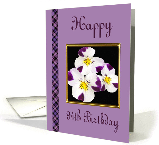 Celebrate a 94th Birthday with this card that features a lavender background, laverender plaid stripe and colorful Johnny Jump-Ups. Card Design ©2013 Kreative Sentiments Cards by Sherry Harris