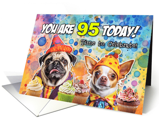 A festive pug and chihuahua in colorful outfits on a confetti type splatter watercolor background and yummy cupcakes with the text! "you are 95 today! Time to Celebrate!" A fun card to send to your favorite 95-year old.