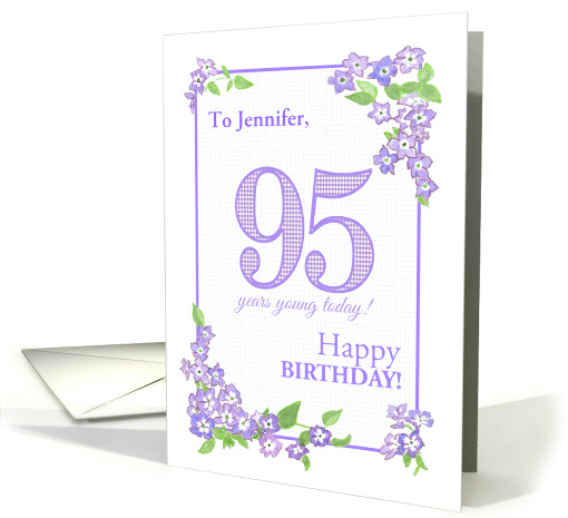 A very pretty 95th birthday card for you to customize with the name of the recipient. There are clusters of blue and purple Phlox flowers around the narrow purple border, painted by hand in watercolours. The front cover greeting is, '95 years young today! HAPPY BIRTHDAY!' on a lightly textured white, basket-weave background and the number 95 is filled with a matching check gingham pattern. There is plenty of space at the top for you to add the name of the recipient and the inside message can also be personalized.