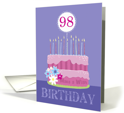 98th Birthday Greetings with this simple pink Birthday cake design in purples and pinks with distressed style lettering. ©DaleSimpson