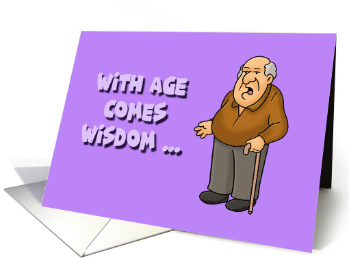 Humorous Adult Getting Older Birthday card with a cartoon older man and the words: With age comes wisdom ... Inside says: ... and grey pubes and saggy balls! Happy Birthday