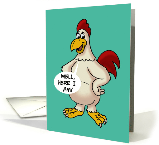 Humorous Adult Birthday Card for her, with a cartoon rooster and the words:Well here I am! Inside says: I heard you wanted a big cock for your birthday!