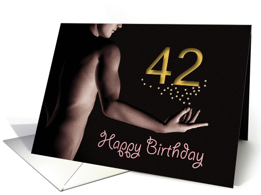 A sexy but tasteful 42nd Birthday card with a nude boy for a very good friend with his or her age on the front and inside a text which you can customize