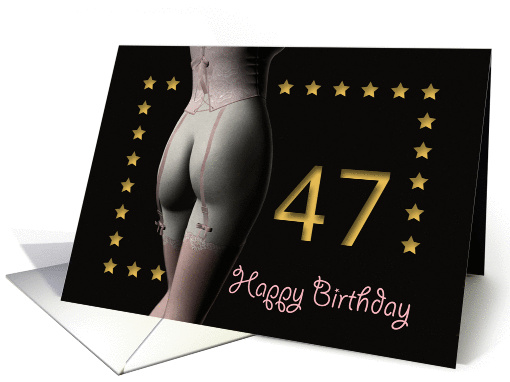 A sexy but tasteful 47th Birthday card of a girl wearing only a corset and a pair of stockings surrounded by golden stars for a very good friend with his or her age on the front and inside a text wich you can customize.
