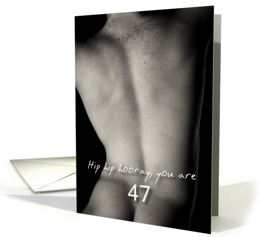 A sexy but tasteful 47th Birthday card with an image of the back of a man for a very good friend with his or her age on the front and inside a text which you can customize.