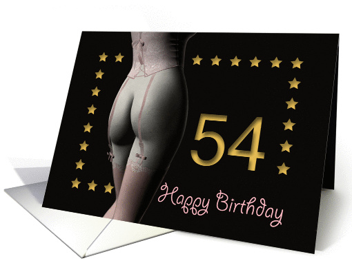 A sexy but tasteful 54th Birthday card of a girl wearing only a corset and a pair of stockings surrounded by golden stars for a very good friend with his or her age on the front and inside a text wich you can customize.