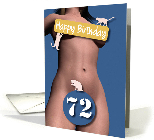 A sexy but tasteful 72nd Birthday card with a nude girl and cats for a very good friend with his or her age on the front and inside a text which you can customize.