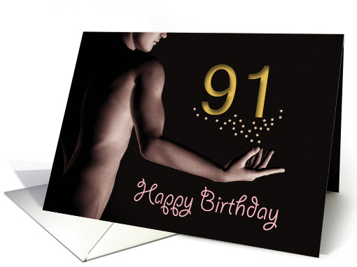A sexy but tasteful 91st Birthday card with a nude boy for a very good friend with his or her age on the front and inside a text which you can customize