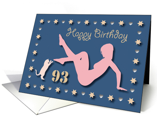 A sexy but tasteful 93rd Birthday card with a silhouette of a girl and a cat playing for a very good friend with his or her age on the front and inside a text which you can customize.