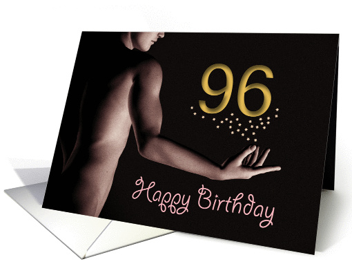 A sexy but tasteful 96th Birthday card with a nude boy for a very good friend with his or her age on the front and inside a text which you can customize