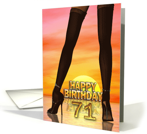 71st birthday card. A fun birthday card with a woman's sexy legs in front of a sunset. The girl is wearing high heels and looks very slim and elegant with a bit of sass.