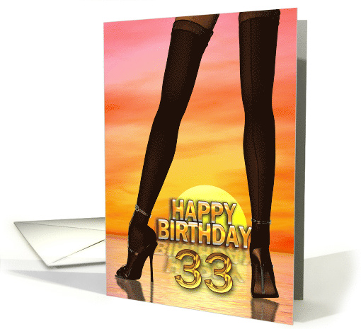 33rd birthday card. A fun birthday card with a woman's sexy legs in front of a sunset. The girl is wearing high heels and looks very slim and elegant with a bit of sass.