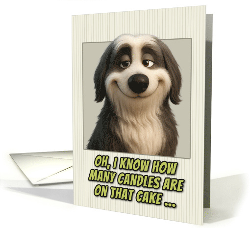 This birthday card features a realistic portrait of an adorable Bearded Collie dog. The dog has expressive brown eyes and a smirk on it's face.The portrait is set against a cream-colored background with subtle vertical pinstripes. Below the dog's image, green text with black outlines reads: "OH, I KNOW HOW MANY CANDLES ARE ON THAT CAKE..." This creates the same humorous birthday message about age awareness, but now from a dog's perspective. The card plays on the idea that pets are always watching and observing their owners, turning this into a playful joke about birthday candle counting and getting older. Perfect card for dog parents, dog lovers, people who appreciate gentle age humor, milestone birthdays, and people who enjoy cards with attitude and personality.