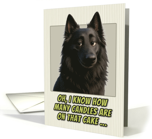 This birthday card features a realistic portrait of an adorable Belgian Sheepdog. The dog has expressive brown eyes and a smirk on it's face.The portrait is set against a cream-colored background with subtle vertical pinstripes. Below the dog's image, green text with black outlines reads: "OH, I KNOW HOW MANY CANDLES ARE ON THAT CAKE..." This creates the same humorous birthday message about age awareness, but now from a dog's perspective. The card plays on the idea that pets are always watching and observing their owners, turning this into a playful joke about birthday candle counting and getting older. Perfect card for dog parents, dog lovers, people who appreciate gentle age humor, milestone birthdays, and people who enjoy cards with attitude and personality.