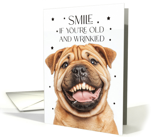A Shar Pei Dog with a big toothy grin and little black dot stars, SMILE if you're old and wrinkled, a great card for anyone