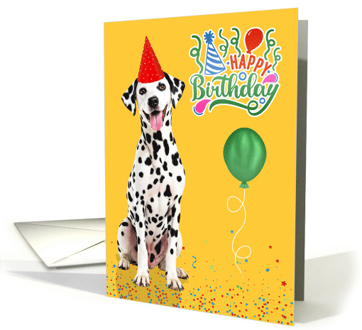 A cheerful birthday card for the Dal dog mom or dog dad with a bright yellow background sprinkled with confetti, a green balloon and a cute dotted red party hat on a happy Dalmatian.