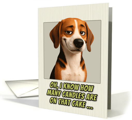 This birthday card features a realistic portrait of an adorable Foxhound. The dog has expressive brown eyes and a smirk on it's face.The portrait is set against a cream-colored background with subtle vertical pinstripes. Below the dog's image, green text with black outlines reads: "OH, I KNOW HOW MANY CANDLES ARE ON THAT CAKE..." This creates the same humorous birthday message about age awareness, but now from a dog's perspective. The card plays on the idea that pets are always watching and observing their owners, turning this into a playful joke about birthday candle counting and getting older. Perfect card for dog parents, dog lovers, people who appreciate gentle age humor, milestone birthdays, and people who enjoy cards with attitude and personality.