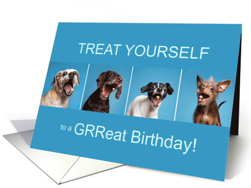 Four adorable dogs, all catching treats in their mouth pairs with a playful birthday message for the dog lover of, "Treat yourself to a GRReat birthday"!