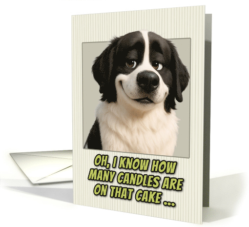 This birthday card features a realistic portrait of an adorable Landseer dog. The dog has expressive brown eyes and a smirk on it's face.The portrait is set against a cream-colored background with subtle vertical pinstripes. Below the dog's image, green text with black outlines reads: "OH, I KNOW HOW MANY CANDLES ARE ON THAT CAKE..." This creates the same humorous birthday message about age awareness, but now from a dog's perspective. The card plays on the idea that pets are always watching and observing their owners, turning this into a playful joke about birthday candle counting and getting older. Perfect card for dog parents, dog lovers, people who appreciate gentle age humor, milestone birthdays, and people who enjoy cards with attitude and personality.