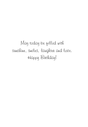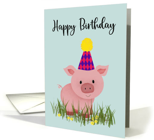 This is a birthday card with a sweet pig wearing a colorful party hat in a patch of green grass and yellow flowers. The text says ‘happy birthday,’ all on a light blue background.