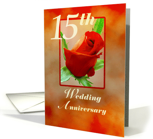 Large font print for ease of readability. Happy 15th wedding anniversary floral card. Red rose bud design. Inside text reads: Happy Anniversary to a lovely sweet couple.
