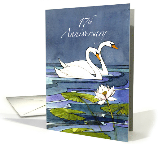 17th Anniversary Swans © Diana Ting Delosh. Ink & watercolor. A pair of white swans swimming side by side. Swans mate for life and are frequently used as a symbol for fidelity and true love. Feel free to change the inside message. Happy 17th Anniversary.