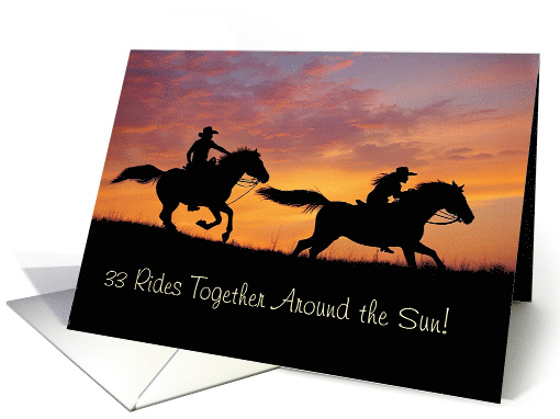 A 33rd wedding anniversary card with a country western theme, depicting a couple having a great time together as the sun sets beautifully in the background.