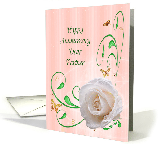 Say happy wedding anniversary to your partner. A lovely white rose to accompany your best wishes. A classic white rose on a pink background. A beautiful way to send your love and regards to a happy couple.