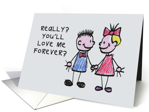 Anniversary card for spouse (either one) with a child-like drawing of two kids holding hands. The words say, Really, you'll love me forever? Inside says, And I still mean it! Happy Anniversary
