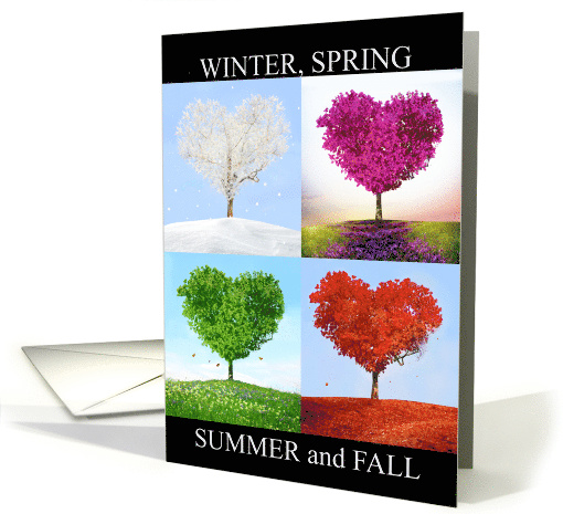 All four seasons, winter, spring, summer and fall trees shaped as hearts creates a unique and wonderful wedding anniversary card for husband or wife.