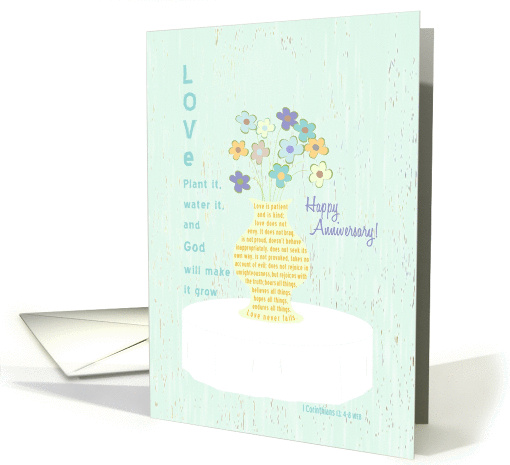 Happy Anniversary, encouraging the recipents to plant and water love and watch God produce growth!Scripture: I Corinthians 13:4-8