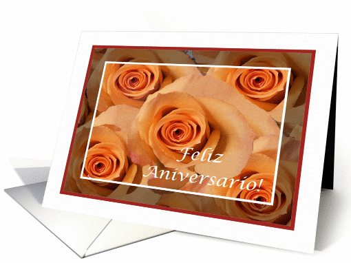 This card has a photography with soft orange roses, a white and transparent frame with line accents, and the Portuguese expression: "Feliz Aniversario" (Wedding Anniversary) (Inside: Happy Wedding Anniversary! May you celebrate this and many more aniversaries with health, love, and happiness)