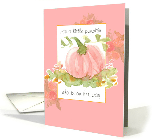 A new baby gift for a little pumpkin on her way greeting card decorated with a soft pink pastel pumpkin and pastel roses on a warm pink background. Customize the front and the inside for your special little newborn.