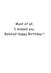 Adorable Belated Birthday teary-eyed snail with a yellow balloon tied to it's tail, is crying. The words above explain: I missed the cake, the candles, and the song. Inside reads: Most of all, I missed you. Happy Belated Birthday.