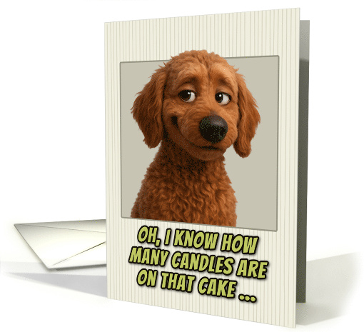 This birthday card features a realistic portrait of an adorable Labradoodle dog. The dog has expressive brown eyes and a smirk on it's face.The portrait is set against a cream-colored background with subtle vertical pinstripes. Below the dog's image, green text with black outlines reads: "OH, I KNOW HOW MANY CANDLES ARE ON THAT CAKE..." This creates the same humorous birthday message about age awareness, but now from a dog's perspective. The card plays on the idea that pets are always watching and observing their owners, turning this into a playful joke about birthday candle counting and getting older. Perfect card for dog parents, dog lovers, people who appreciate gentle age humor, milestone birthdays, and people who enjoy cards with attitude and personality.
