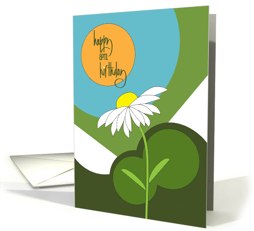Delight your friends and family members who celebrate their birthdays in April with this stunning daisy card. The card's white and yellow daisy rolls towards the orangish sun, in the top left corner. Hand lettered, across the sun, are the words "Happy April Birthday", in deep green. Leaves of various shades of green fill the lower part of the card with dynamic leaf shapes. The inside wording of the card says "Have a wonderful day!"