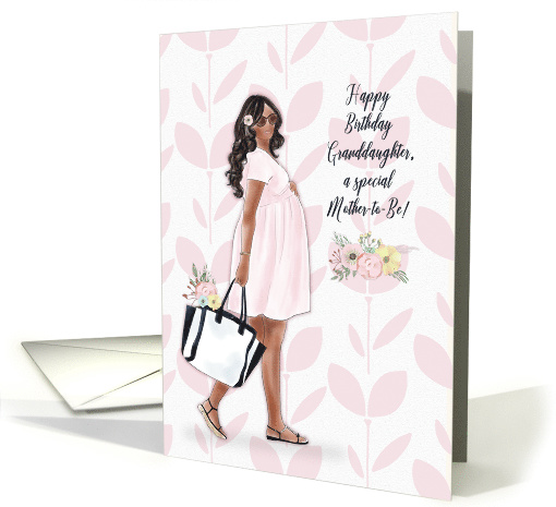 Send this lovely, pretty in pink Happy Birthday design to your granddaughter who is expecting a baby. The design includes a modern young African American woman carrying a purse full of flowers. The background is a pattern of pink flowers. The front sentiment is "Happy Birthday Granddaughter, a special Mother-to-Be.