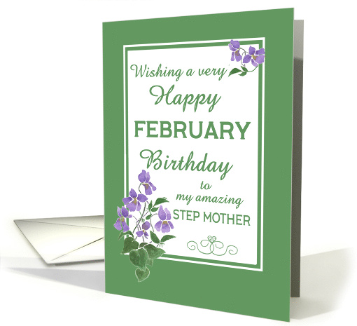 A very pretty February birthday card for your stepmother, with a hand painted clump of Wood Violets and a leaf green border. The front cover greeting is, 'Wishing you a very Happy FEBRUARY Birthday, to my amazing STEP MOTHER' in green lettering. The inside message is just a suggestion which you can easily edit or delete altogether, if you prefer a 'blank inside' card.