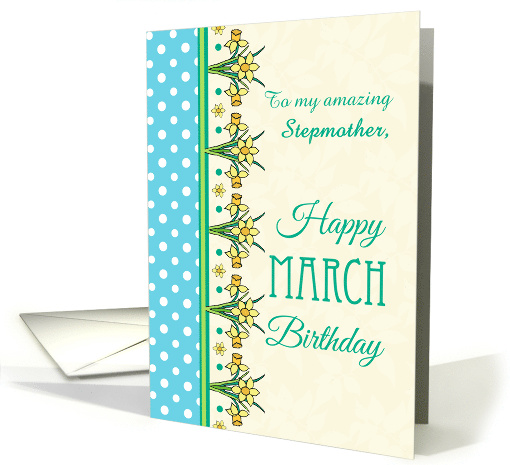 For Stepmother March Birthday with Pretty Daffodil Border and Polkas
