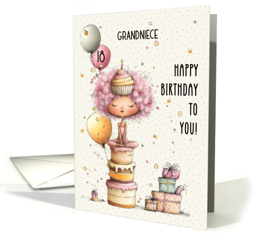 Send happy 18th birthday greetings to your grandniece with this whimsical design featuring a teenage girl sitting atop a birthday cake surrounded by balloons, presents, and confetti.