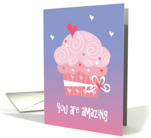 This fun card is a delightful way to greet ladies you know on their birthday and let them know how amazing you think they are. The wording "You are amazing" fills the bottom of the pink and lavender card, while a swirl decorated pink cupcake sits above. The cupcake has brightly colored sprinkles, mounds of pink frosting, a white ribbon tied around the cupcake holder and hearts of all sizes adding affection to it. Perfect for women friends, family, work colleagues and neighbors, the inside wording of the card says "Wishing a very special lady an amazing birthday!"