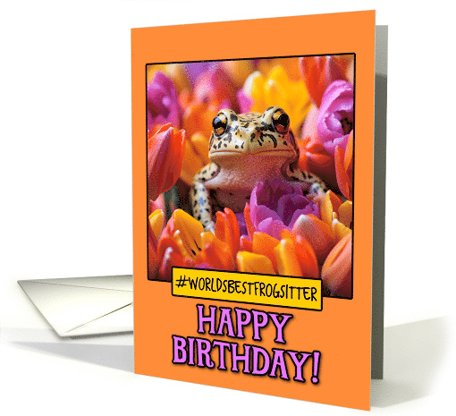 A fun and colorful birthday series featuring pets and flowers. This frog sitting amongst the tulips on an orange background and the hashtag #worldsbestfrogsitter is wishing you a happy birthday. A wonderful design to send to a reptile sanctuary or that special someone who takes care of your pet frog when you are away and wish them a happy birthday!