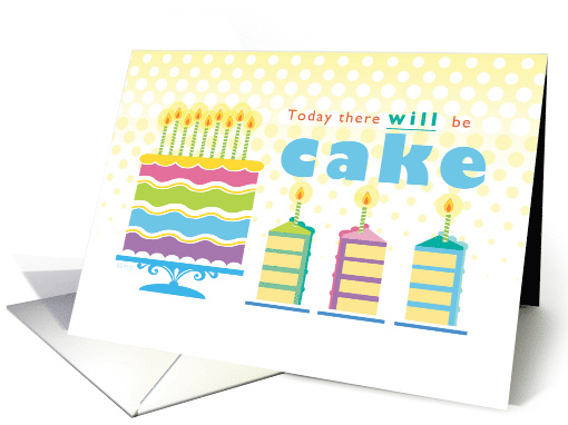 A tall birthday cake with bright pastel icing topped with green lit candles sits to the side of text that reads "today there will be cake". Three slices of 4 layer cake sit underneath the text and a yellow and white polka dots provide the background for these traditional birthday desserts. İMindy Pierce