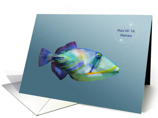 Hau'oli la Hanau means happy birthday in Hawaiian. The Humuhumunukunukuapua'a (reef trigger fish) is the state fish of Hawaii.