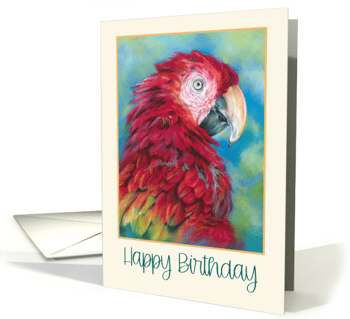 Send a birthday wish for a day full of color and sunshine with this handsome parrot art card. The design features a magnificent macaw posed in profile with fluffed feathers in vibrant red and yellow with accents of green and blue.