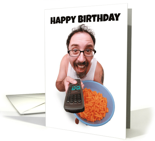 Wish someone a Happy Birthday doing whatever it is that makes them happy with this hilarious fisheye photograph of a guy holding a bowl of cheese curls as he happily flips though the tv channels with his remote!