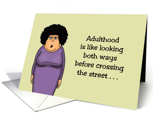 Humorous Birthday card with a cartoon character on a greenish background. The words say: Adulthood is like looking both ways before crossing the street . . . Inside says: . . . then getting hit by an airplane! Happy Birthday
