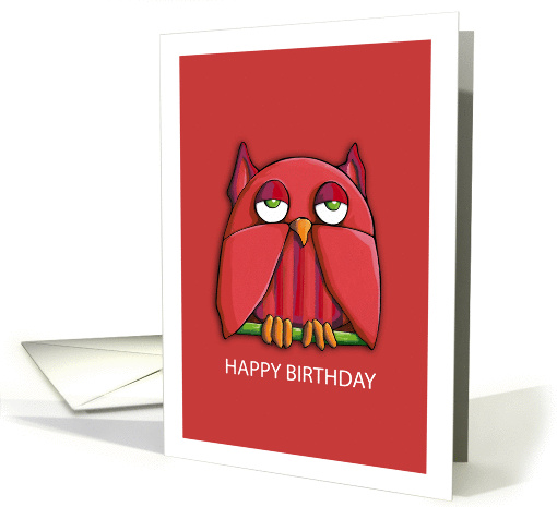 Original illustration of a red owl, looking slightly grumpy or bored! A cute whimsical design, perfect for a birthday or for anyone who loves owls or birds.