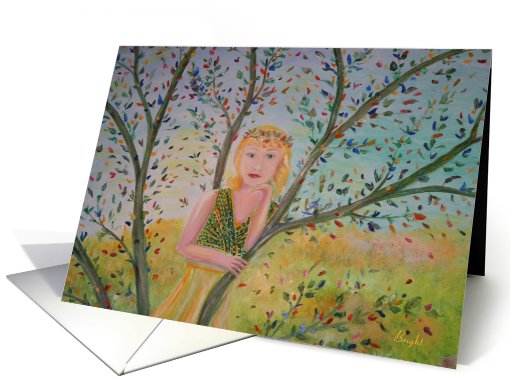 Original oil painting by Bright. This whimsical girl has fun hanging around in the trees with blossoms and beauty surrounding her all day long. Card design and verse by Bright. Thanks for shopping with me.