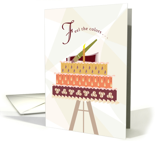 Illustrated Happy Birthday card for an artist. Tiered cake on an easel pedestal topped with paint brush and paint tube. Appropriate for any type of artist.